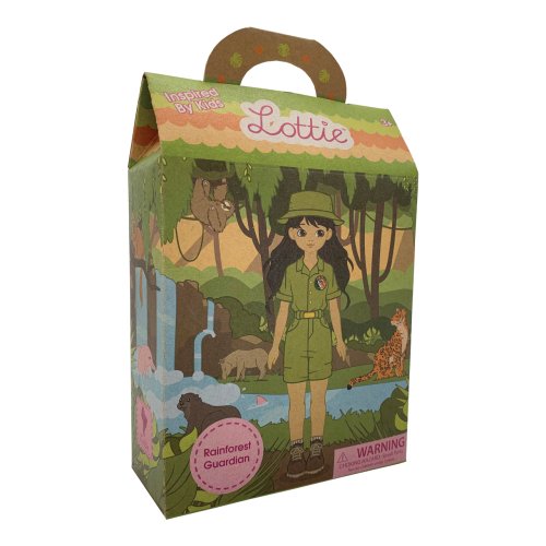Se svým dalekohledem a lupou je připravena zkoumat a strážit deštný prales, který je domovem mnoha ohrožených zvířat a rostlin. Příroda přece skýtá tolik dobrodružství, proto je potřeba ji chránit. Ve spolupráci s organizací Rainforest Trust přichází kolekce Lottie s panenkou, která děti prostřednictvím sady kartiček provede vzácnou Amazonskou přírodou. Jako ostatní panenky z oceňované kolekce Lottie je i tato realistická a snaží se děti naučit upřímnému pohledu na svět. Lottie jsou navrženy a zvláště uzpůsobeny malým dětským ručkám, mají pohyblivá kolena a jsou vyrobeny z prémiového měkkého vinylu a nylonu, bez použití ftalátů. Každá panenka je dodávána v atraktivní barevné kartónové taštičce s plastovým průhledem a uchem. Hlavní vlastnosti:kloubová panenka s pohyblivými koleny, perfektní pro představivou hruprémiové nylonové vlasy jsou hebké na dotek a nezamotávají sepanenka z vinylu bez obsahu ftalátů, měkká na dotekpanenka má snímatelné boty a stojí samostatněhnědé vlasy a hnědé očimilované všemi dětmi, vhodné od 3 letmalá a roztomilá panenka ve velikosti 18 cm Balení obsahuje:Lottie, milovnice zvířat a strážkyně parku, vybavená zelenou kombinézou s páskem, bílými ponožkami, hnědými botami a kloboučkemdalekohled, lupa a 10 sběratelských kartiček