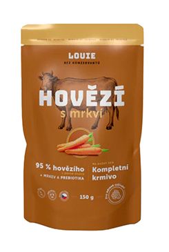 Praktická kapsička plná kompletního krmiva. Obsahuje 95 % hovězího masa v pevné složce a 5 % rostlinné složky, vitamínů a minerálů. Přidaná mrkev dodává psům potřebné živiny a minerály, takže tvůj psí parťák bude mít vše, co potřebuje pro zdravý a aktivní život.