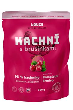 Praktická kapsička plná kompletního krmiva. Obsahuje 95 % kachního masa v pevné složce a 5 % rostlinné složky, vitamínů a minerálů. Přidané brusinky napomáhají udržení zdravé močové soustavy a podporují peristaltiku střev. A po Louie zbyde jen vylízaná miska.