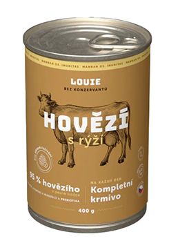 Kompletní krmivo bez obilnin pro psy každého věku i plemene, hovězí s rýží. Nabízí Vašemu miláčkovi možnost stravy z kvalitního masa (95 % v pevné složce). Pro podporu peristaltiky střev a simulaci minoritní rostlinné složky v potravě psů slouží příměs rýže. Krmivo neobsahuje žádné konzervanty, dochucovadla ani barviva, pouze 95 % masa, 5 % rýže, vitamínů a minerálů.