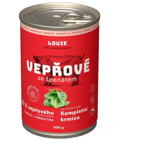 Šťavnaté kompletní krmivo obsahuje 95 % vepřového masa v pevné složce. Zbylých 5 % je rostlinná složka zastoupená špenátem. Konzerva je obohacená o prebiotika – zdraví prospěšnou rostlinnou vlákninu – ve formě mannanoligosacharidů (MOS) a fruktooligosacharidů (FOS), které posilují střevní mikroflóru. Krmivo tím přispívá k normální funkci trávicího a imunitního systému. Hlavní přednosti: