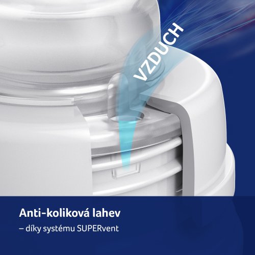 Dynamická špička savičky - Špička je vyrobená z tenké vrstvy silikonu a dynamicky se přizpůsobuje sání miminka (prodlužuje se). Povzbuzuje svaly čelistí k aktivní činnosti. Mléko nevytéká, dítě ho musí aktivně sát. Pevná základna savičky - Pevná základna ze silnějšího silikonu umožňuje stabilní oporu pro správné umístění rtů na savičce. Systém odvzdušňování SUPER air vent Anti-colic - Nový, efektivní odvzdušňovací systém SUPER VENT zabraňuje smíšení mléka se vzduchem. Tímto způsobem se sniží riziko kolik. Profilovaný tvar láhve - Usnadňuje správné držení láhve a podávání pokrmu. Stužka na dudlík s klipem - dudlík bude vždy po ruce