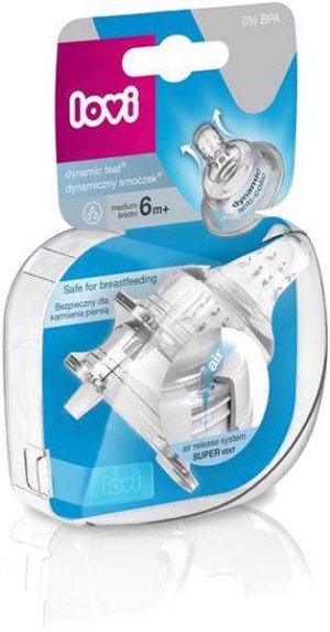 Dynamický dudlík Lovi vyrobený z nestejnorodých vrstev silikonu v průběhu krmení modifikuje svůj tvar (prodlužuje se), přizpůsobuje se rytmu a síle sání dítěte podobně jako matčin prs při kojení.