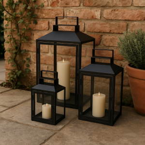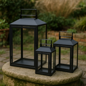Elegantní kovové lucerny ve třech velikostech, ideální pro dekoraci interiéru nebo venkovního prostoru. Sada nabízí harmonickou kombinaci malých, středních a velkých luceren, které se skvěle doplňují a vytvářejí stylovou atmosféru.