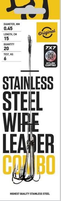 Ocelová lanka Stainless steel wire leader combo Ocelová lanka Stainless steel wire leader combo jsou spolehlivá ocelová lanka určená pro lov štik. Měkká ocelová vazba ze sedmi drátů je z vnější strany potažena syntetickou nití se speciální impregnací. Lanka jsou vybavena kvalitním obratlíkem (pro připojení kmenového vlasce) a obratlíkem se sponou (pro uchycení nástrahy). Použití dvou obratlíků výrazně minimalizuje kroucení vlasce, což ocení každý rybář.