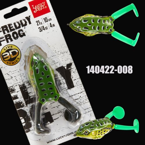 FREDDY FROG je pravá imitace žáby se dvěma nohami a silným dvojhákem, který je integrován do těla tak, aby se nástraha neustále nezamotávala při vedení zarostlým terénem. Měkký pryžový povrch nástrahy Lucky John – FROG je určen pro rybaření v nejtvrdších podmínkách, v silně zarostlých vodních plochách, kde není možné použití jiných nástrah. Hlavní cílovou rybou je štika. Hlavní způsob navádění — lehké škubání návnady v krátkých intervalech 1-1,5 sekundy. Úder by neměl být prováděn ukvapeně, aby se předešlo nízké účinnosti zákusů. Proto se doporučuje následující schéma. Když uvidíte, že štika žábu prakticky chňapla, nevytahujte jí návnadu zpod nosu ani z tlamy. Naopak byste měli šňůru povolit, počkat 1,5-2 sekundy a teprve potom provést akcentovaný úder.