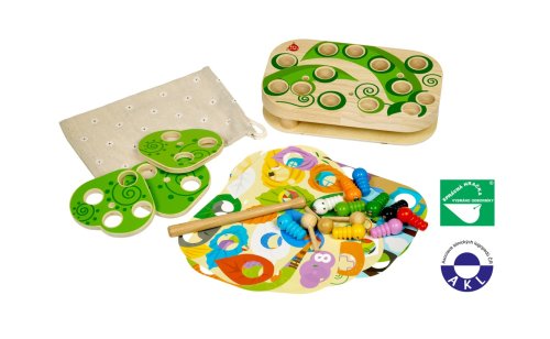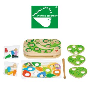 Chytání housenek je dřevěná motorická stolní hra s magnety, která se skládá ze základní dřevěné desky, 7 barevných vyměnitelných předloh, 10 barevných housenek s magnetem, magické hůlky s magnetem, 3 otáčivých listů, 3 kolíků pro upevnění listů a lněného pytlíku. Šibalské housenky začaly hrát na schovávanou! Najděte a chyťte je společně s dětmi pomocí kouzelné hůlky s magnetem. Způsobů, jak pochytat housenky je spousta. Pro menší děti přiložte na základní desku jednu z barevných předloh, vložte housenky do otvorů například podle barev a lov kouzelnou magnetickou hůlkou může začít. Vyměňováním předloh mohou děti housenky lovit například z barevných listů, domečků nebo také podle čísel. Starším dětem ztížíte chytání housenek tím, že na předlohu přidáte otáčivé listy, které zafixujete kolíkem tak, aby se mohly po předloze rotačním způsobem pohybovat a tím lovení ztížíte. Tato hra je velmi užitečná pro rozvoj logického myšlení, kreativity, obratnosti a dětské motoriky. Součástí výrobku je lněný pytlík, do kterého si menší části hry pěkně uložíte.