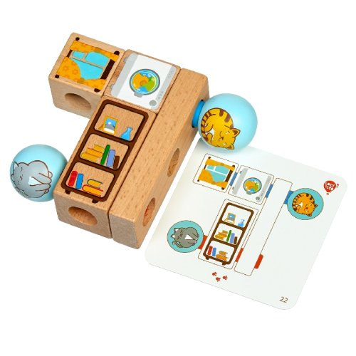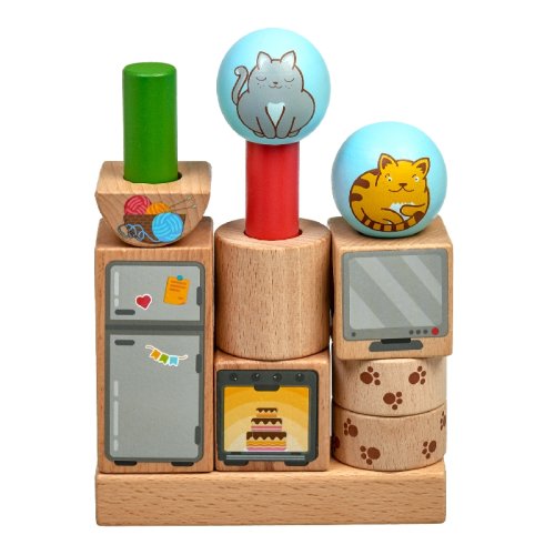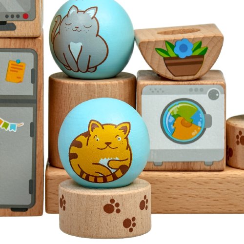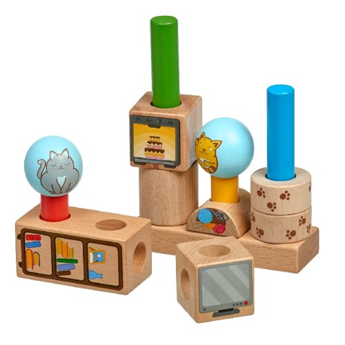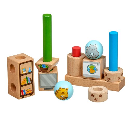 Hravé kočky je dřevěná skládačka s různými geometrickými tvary. Součástí je základna s kulatými kolíky, různé geometrické barevné tvary s motivem kočiček a nábytku a 24 předloh. Cílem hry je vyzkoušet různá uspořádání a umístit všechny tvary na kolíky dle předloh. Po skončení hry lze skládačku umístit do lněného pytlíku. Skládačka je skvělá pro rozvoj logického myšlení, jemné motoriky a dětské představivosti. Rozměr základny 14 x 2,5 x 4,5 cm. Délky kolíků jsou: 8 cm 14 cm, 18 cm a průměr 2 cm. Geometrické tvary mají různorodé rozměry. Rozměr karet 12 cm x 12 cm.