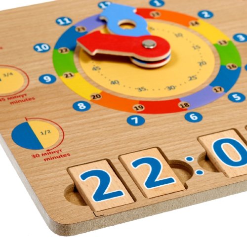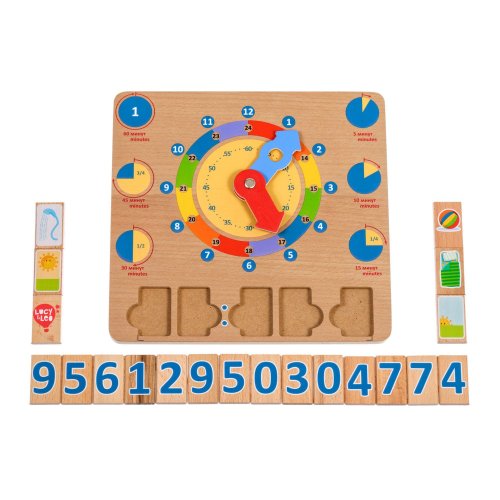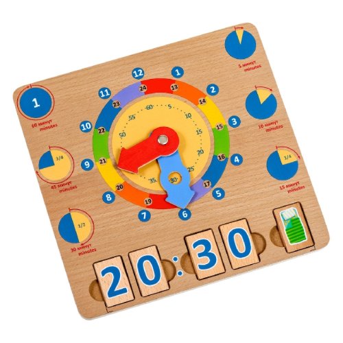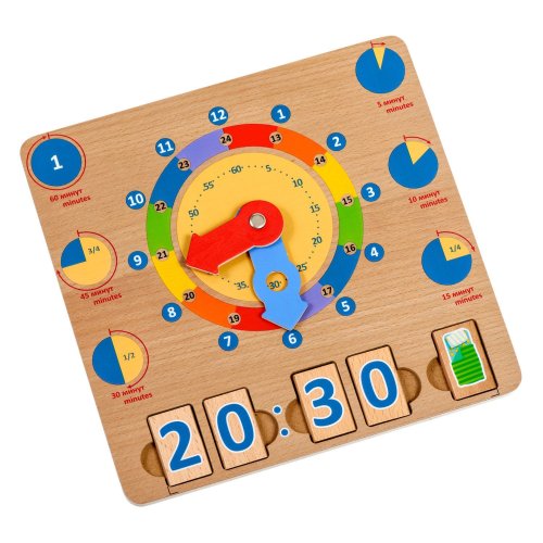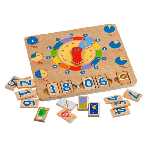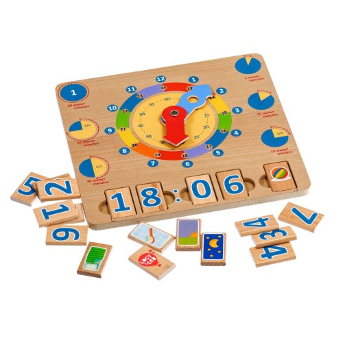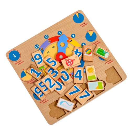 Dřevěnou naučnou hrací desku s hodinami lze využít k učení času a hodin. Deska obsahuje obrázky různých časových intervalů a velké barevné hodinové ručičky s jasnými časovými segmenty. Dále ji tvoří 14 bloků s čísly a 6 bloků s obrázky denních činností. Čtyři časové bloky lze vložit do zdířek tak, aby představovaly digitální hodiny, a pátý blok představuje akci, která je přítomna v denním režimu dítěte ve stanovenou dobu. Tímto hravým způsobem se děti rychle naučí pouhým pohledem rozeznávat a určovat čas a hodiny. Rozměr desky 24 x 24 x 1cm, rozměr bloků 4 x 2,5 cm