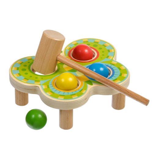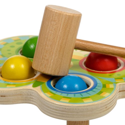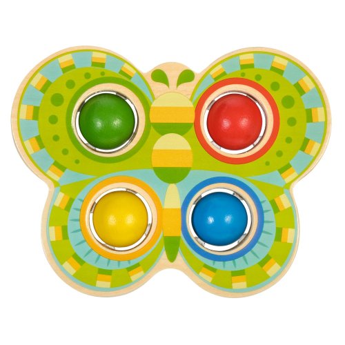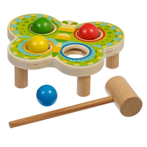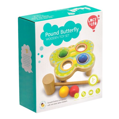 Motýl je designově netradiční dřevěná zatloukačka ve tvaru krásného barevného motýla se 4 barvenými koulemi, která zdobí jeho křídla. Je to zábavná hra, při níž děti kladívkem udeří do barevných koulí a ty následně propadnou do otvorů odpovídající barvy. Hračka slouží k rozvoji jemné motoriky, koncentrace a koordinaci pohybu. Šířka křídel motýla 21 cm, délka 20 cm, výška 5 cm. Rozměry kladívka 19 x 6 cm, průměr koule 3,5 cm.