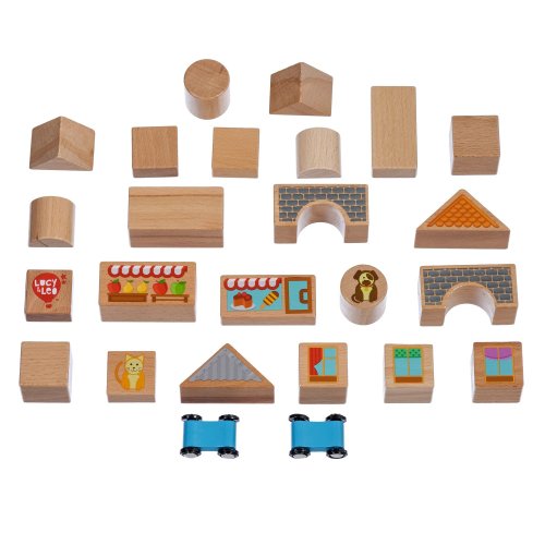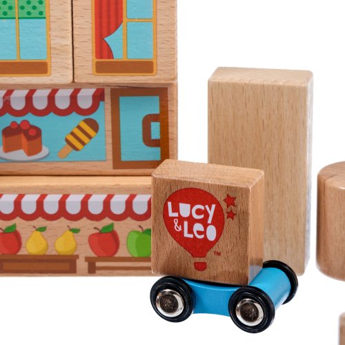 Město - sada dřevěných kostek je vždy oblíbenou hračkou pro mnoho generací dětí. Sada obsahuje kostky různých barev a tvarů: kostky, trojúhelníky, válce, můstky plus dvě pojízdná autíčka. Na některých kostkách najdeme vyobrazenou vitrínu obchodu, střechu, okna nebo zvířátka. Složením všech kostek děti vytvoří celé město, ve kterém pak autíčka mohou cestovat. Děti si procvičují motorické schopnosti, obratnost a logické myšlení. Po skončení hry se kostky umístí do praktického kulatého boxu s uzavíratelným poklopem a držadlem k přenosu. Rozměry kostek cca 3,5 cm, 5 cm, 7 cm. Délka autíček 4 cm.