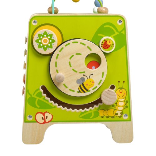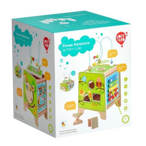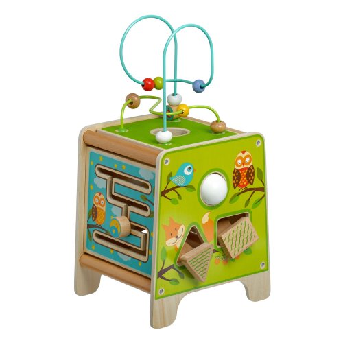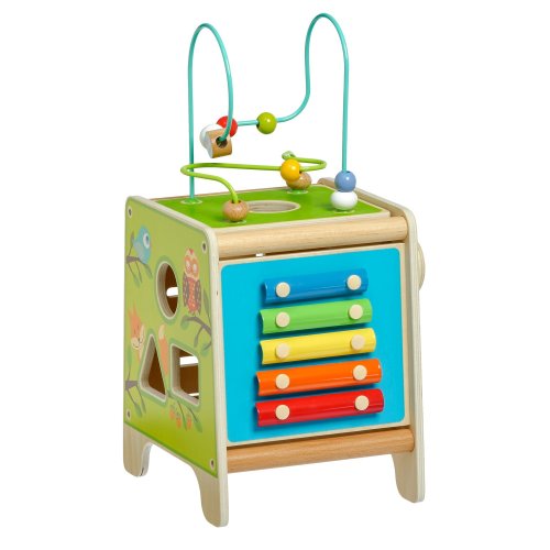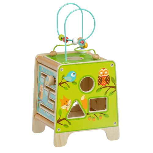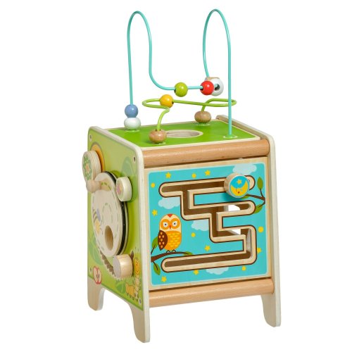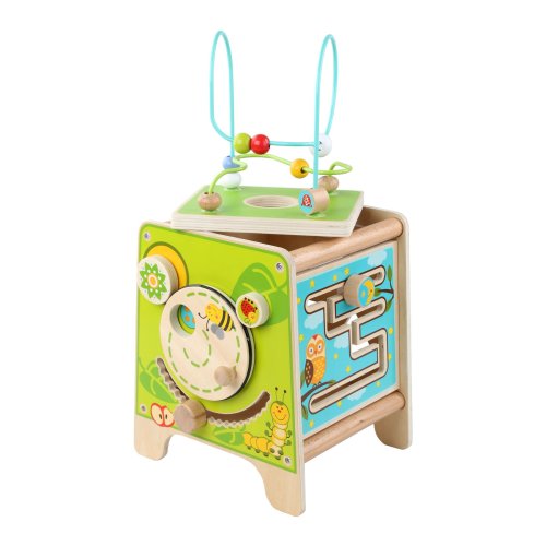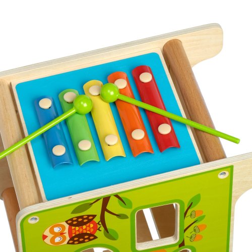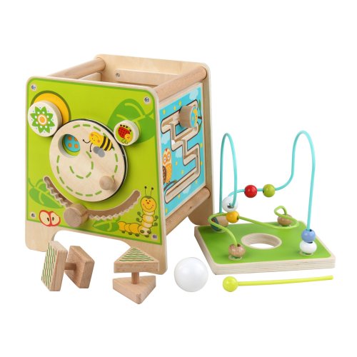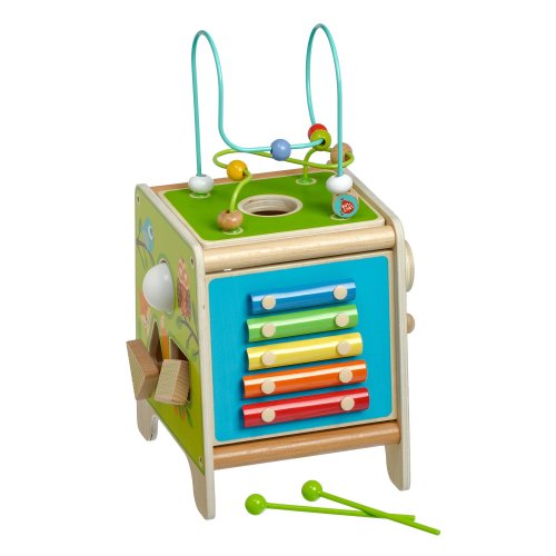 Dřevěná motorická kostka 5v1 s xylofonem kombinuje několik vzdělávacích a zábavných prvků najednou. Nahoře najdete korálkový labyrint se dvěmi zakřivenými kolejnicemi, který se dá vyjmout a otočit směrem do kostky tak, aby byl zcela uschován. Na ostatních stranách je xylofon s paličkami, vkládačka dvoudílných rotačních geometrických tvarů, dřevěný motorický labyrint, rotující kolečko, otočné prvky a zábavná hra s přesouváním kolíčku v drážce. Všechny strany jsou zdobeny krásnými barevnými obrázky a zábavnými postavičkami zvířátek, které udržují pozornost dítěte, podporují fantazii a senzomotorické schopnosti. Délka kostky 20 cm, výška 26 cm. Výška labyrintu 18 cm. Délka paliček 15 cm. Velikost geometrických tvarů cca 5,5 cm.