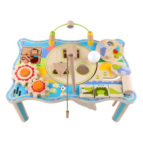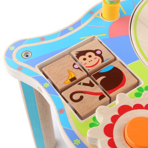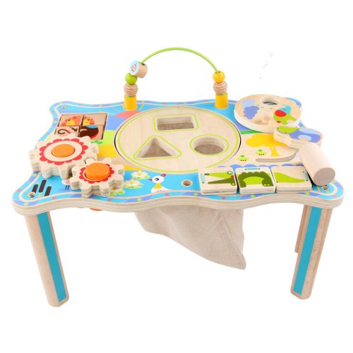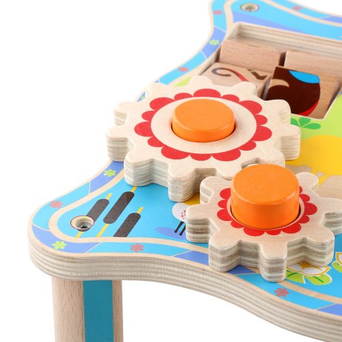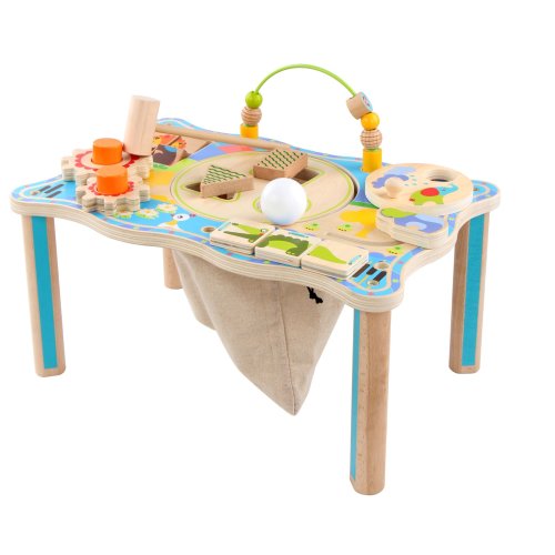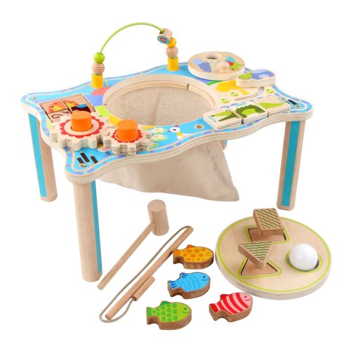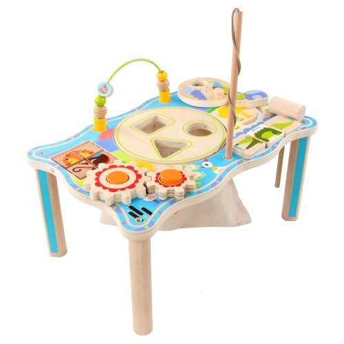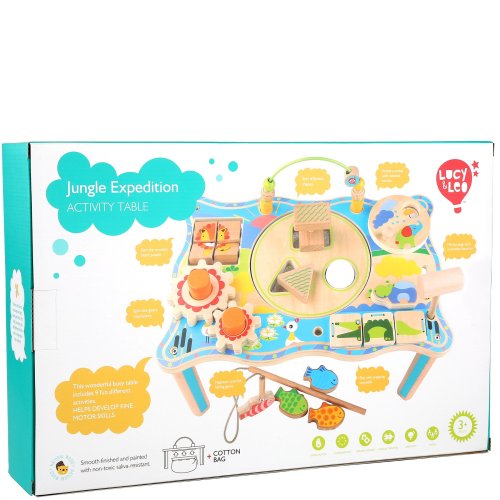Dřevěný multifunkční stoleček je navržený tak, aby upoutal pozornost dítěte a vyvolal v něm zvědavost. Je zdobený barevnými obrázky z džungle a má mnoho interaktivních částí. Dřevěná ozubená kola se dají otáčet, korálky se mohou přesouvat po kolejnici, je zde umístěna také zatloukačka, barevné kostky a mnoho dalšího. Uprostřed stolečku je umístěný lněný pytlík, ze kterého se dají udičkou, na jejímž konci je magnet, chytat malé dřevěné rybky, které jsou také opatřeny magnetem. Tento otvor se dá uzavřít poklopem, který je opatřen třemi otvory různých tvarů a slouží jako vkládačka. Aby 2 dvoudílné dřevěné vkládací prvky propadly do pytlíku, je potřeba jimi správně pootočit. Tato víceúčelová hračka využívá řadu životně důležitých dovedností dítěte a podporuje průzkumnou hru, na které se může podílet několik hráčů a společně řešit různé hádanky. Délka stolečku 41,5 cm, šířka 27 cm, výška 21 cm. Průměr otvoru ve stolečku 19 cm, průměr tvarů určených do otvoru cca 4 cm. Délka rukojeti udičky 24 cm, velikost rybiček 6,5 cm. Délka kladívka 18,5 cm.