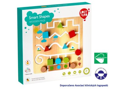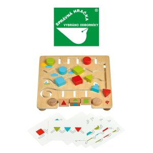 Geometrické tvary s předlohami je dřevěné bludiště, které dětem pomáhá rozvíjet logické myšlení a senzomotorické dovednosti. Dřevěná herní deska s hladkým povrchem má řadu různých klikatých cestiček s barevnými dřevěnými tvary. Děti se snaží daný tvar posouvat po cestičce tak, aby se shodoval s tvarem na jednom ze tří rotujících bloků umístěných ve spodní části hrací desky, nebo pracují s 12 papírovými předlohami (6 oboustranných karet), které nabízejí další úkoly. Hra je ideální i na cesty. Rozměr hrací desky 30 x 30 x 5 cm. Tato hračka je označována jako Montessori pomůcka.