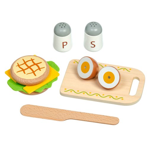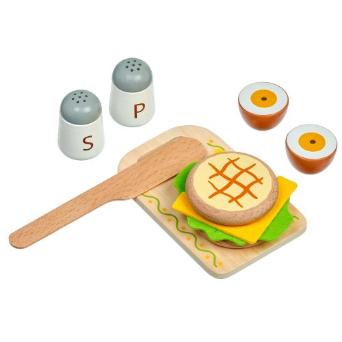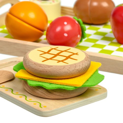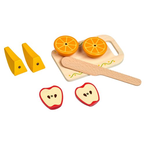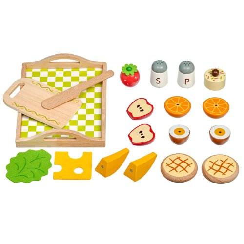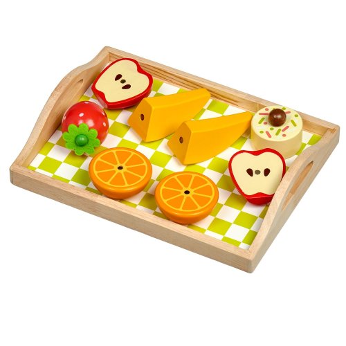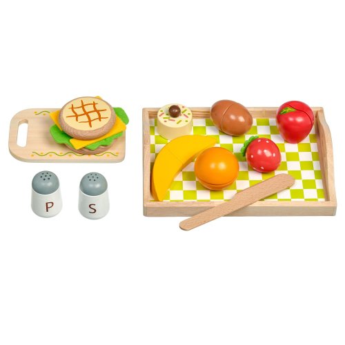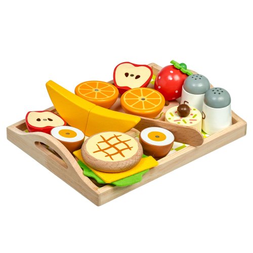 Snídaně na podnosu je dřevěná herní sada věrně napodobující bohatou snídani. Jednotlivé dílky potravin jsou spojeny magnetem a je možné je jednoduše krájet přiloženým nožem na dřevěném prkýnku. Dřevěné potraviny rozvíjí vnímání tvarů, napodobování činnosti dospělých a fantazii. Samotné krájení podporuje rozvoj jemné motoriky. Balení obsahuje: 1 dřevěné prkénko na krájení, 1 dřevěný nůž, solničku a pepřenku, 7 kusů dřevěných potravin ke krájení: 1x houska ke krájení (2 půlky), 1x sýr, 1x list salátu, 1x vejce ke krájení (2 půlky), 1x banán ke krájení (2 půlky), 1x jablko ke krájení (2 půlky), 1x pomeranč ke krájení (2 půlky), 1x jahoda, 1x dortík. Délka podnosu 24 cm, šířka 18 cm, výška 2 cm. Délka prkénka ke krájení 15 cm. Průměr solničky a pepřenky 4 cm. Průměry jídla a ovoce od cca 4 cm do cca 7 cm. Všechny díly jsou vyrobeny z kvalitního dřeva, plátek salátu a sýra je vyrobený z látky, plsti.