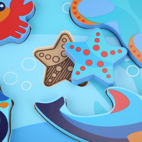 Mořští živočichové je dřevěné vkládací puzzle bez úchytek s motivem živočichů žijících v moři, které potěší holky i kluky. Na hladké barevné desce jsou nakreslená různé zvířátka. Šest vystouplých dřevěných tvarů zvířátek lze jednoduše uchopit a vložit do správných vyfrézovaných drážek na barevnou desku. Díly jsou velké, krásně ilustrované a dětem se díky své velikosti berou velmi dobře do ruky. Tvar a tloušťka jednotlivých dílků umožňuje zvířátkům i samostně stát. Na této vkládačce si děti procvičí jemnou motoriku, prostorovou orientaci a v neposlední řadě trpělivost. Výška desky 21 cm, délka 29 cm, velikost živočichů cca 13,5 a 5 cm, tloušťka cca 1 cm.