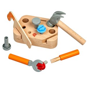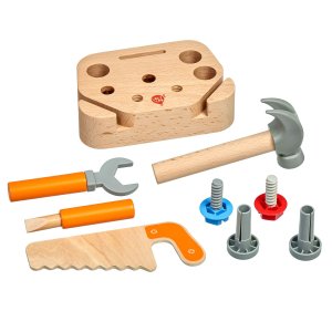 Dřevěná sada nářadí „Malý tesař“ je hračka pro malé děti, které se při hraní mohou učit o řemeslu. Sada se skládá z 9 dílů a je vyrobena z plastu a kvalitního dřeva s hladkou povrchovou úpravou. Obsahuje sortiment nástrojů uspořádaných do stojanu. Patří mezi ně dřevěná pila, kladivo, klíč, šroubovák - stejně jako speciální hřebíky a šrouby. Sada podporuje nápadité a kreativní myšlení, zdokonaluje jemnou motoriku. Rozměry stojanu 11 x 16,5 x 4,5 cm.