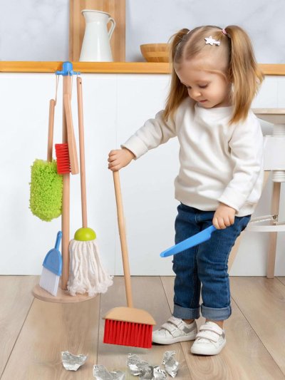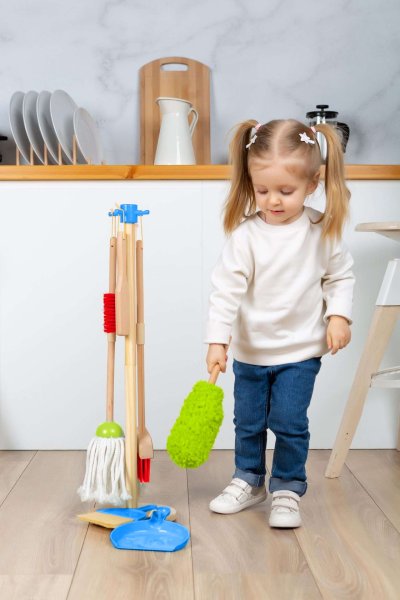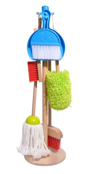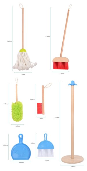 Uklízecí sada je dřevěná hračka, která nesmí chybět v žádné domácnosti. Vytírání, zametání nebo utírání prachu jde s tímto uklízecím setem zcela snadno a každý kluk či holčička tak mohou doma začít pomáhat s drobným úklidem. Děti se tak učí zábavným a hravým způsobem základům běžného úklidu v domácnosti. Hračka pomáhá rozvíjet motorické dovednosti dítěte a jeho smysl pro odpovědnost. Sada obsahuje: velký smeták, mop, prachovku, malý smeták s rukojetí, plastový smetáček s lopatkou a stojan, na který si po skončení úklidu všechny pomůcky pověsíte. Stojan je stabilní a spolu s náčiním odpovídá dětské velikosti. Rozměry výrobku: 20 x 20 x 67 cm. Dřevěné díly vyrobeny z pryžového dřeva (Hevea).