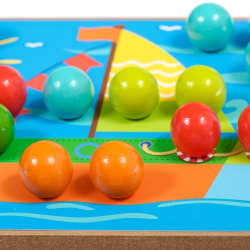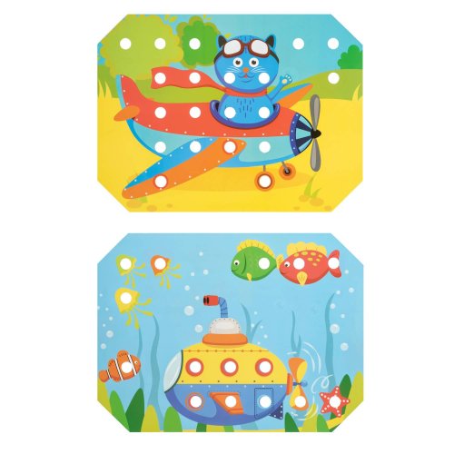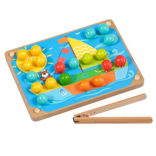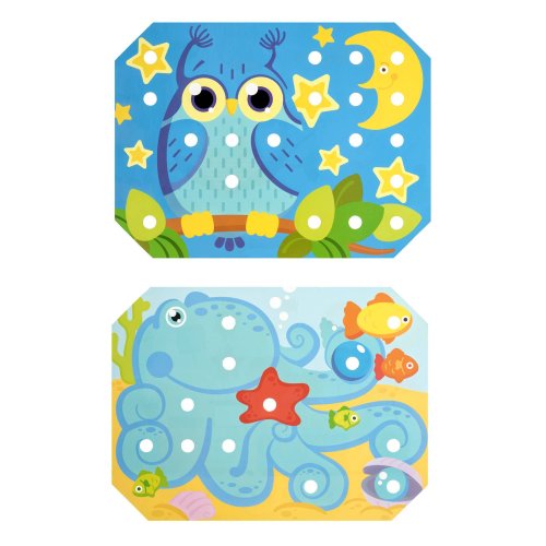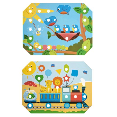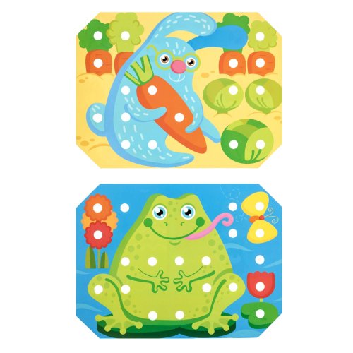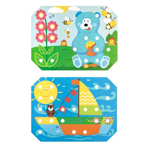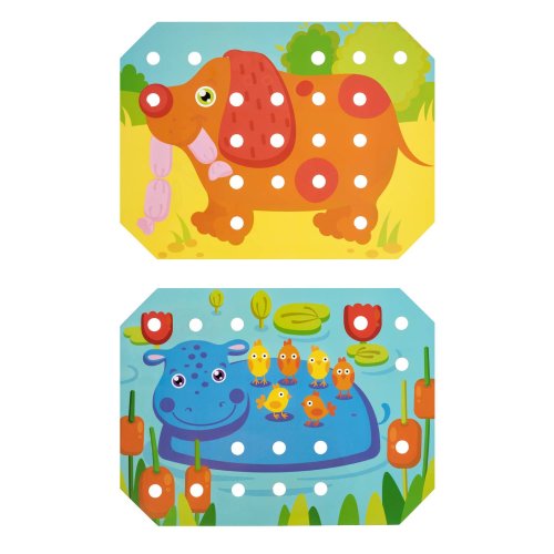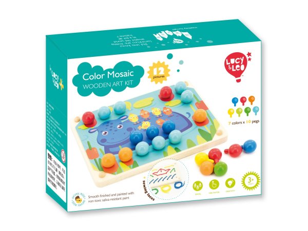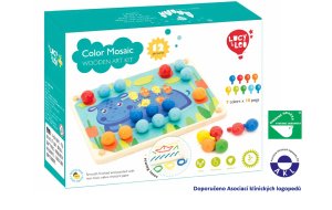 Mozaika s pinzetou a vyšívání je dřevěný herní set rozvíjející jemnou dětskou motoriku, tvořivé myšlení a znalost barev. Balení obsahuje 70 velkých dřevěných barevných kolíčků, 1 pinzetu pro uchycení kolíčků, 12 barevných oboustranných obrázků se zvířátky, dřevěný podstavec s otvory na kolíčky a 4 barevné tkaničky k vyšívání. Dítě si vybere jednu z barevných předloh, položí jí na dřevěný podstavec a začne obrázek vyplňovat pomocí přiložené pinzety barevnými kolíčky, nebo rukou. Pokud děti mají chuť, mohou barevnými tkaničkami také vyšívat. Rozměry dřevěného podstavce 20,5 x 15 cm. Délka tkaniček 64 cm. Výška kolíčku s kulatou hlavičkou 2,8 cm, průměr 1,5 cm. Po skončení hry lze dřevěné kolíčky umístit do lněného pytlíku, který je součástí balení. Tato hračka je označována jako Montessori pomůcka.
