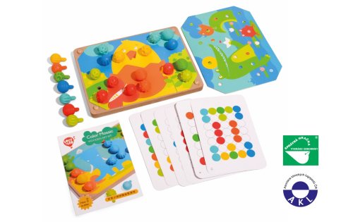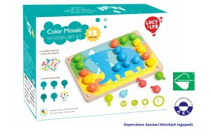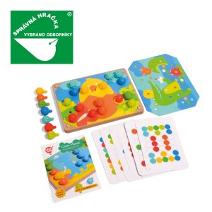Mozaika a vyšívání je herní set pro děti rozvíjející jemnou motoriku a tvořivé myšlení. Balení obsahuje 35 velkých silikonových kolíčků s odlišně strukturovaným povrchem v 7 barvách. Dále obsahuje 12 barevných obrázků se zvířátky a 6 oboustranných předloh, dřevěný podstavec s otvory na kolíčky a 4 barevné tkaničky k vyšívání. Dítě si vybere jednu z barevných předloh, položí na dřevěný podstavec a začne obrázek vyplňovat barevnými kolíčky. Starší děti mohou skládat podle oboustranných předloh, které se na podstavec už nepřikládají. Pokud děti mají chuť, mohou barevnými tkaničkami také vyšívat. Rozměr dřevěného podstavce 20,5 x 15 cm. Délka tkaniček 64 cm. Délka kolíčku s kulatou hlavičkou 2,8 cm, průměr 1,5 cm. Tato hračka je označována jako Montessori pomůcka.