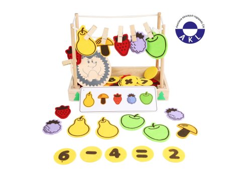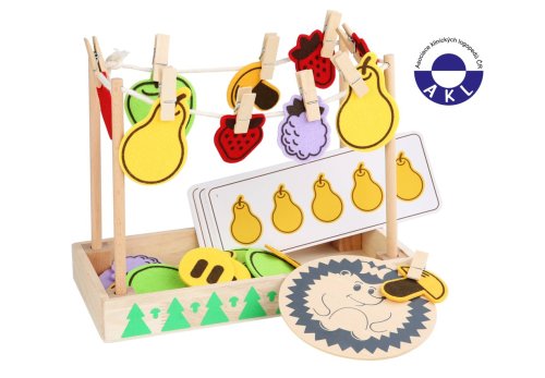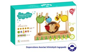 Vzdělávací hra "Ježek" je další hrou patřící do skupiny Montessori hraček. Děti milují, když mohou měkké, na dotek příjemné ovoce nebo zeleninu „sušit“ pomocí malých kolíčků a učit se nové věci. Tato hra nabízí dětem nevšední způsob poznávání ovoce a zeleniny a později jim zábavným a hravým způsobem pomáhá představit si počáteční pojmy matematiky. Připravuje děti na setkání s číslicemi a aritmetickými znaménky. Navíc silně podporuje smyslové vnímání díky interakci s prvky z různých materiálů, jako je dřevo, plsť a lano. Podporována je velmi i jemná motorika. Různé detaily zaujmou děti na dlouhou dobu, rozvíjí u nich vytrvalost a pozornost. Bohaté balení obsahuje dřevěnou základnu se 4 sloupky, mezi kterými je zavěšené malé lanko, 10 dřevěných kolíčků, dřevěného ježečka na zadávání úkolů, 6 oboustranných karet s předlohami, perforované barevné podložky z plsti s ovocem a zeleninou plus podložky s číslicemi a matematickými znaménky. Po ukončení hry lze jednotlivé drobné díly bezpečně uložit do přiloženého bavlněného pytlíčku. Rozměry složené herní sady: 30 x 16 x 22 cm, průměr ježka 14 cm. Rozměry kartiček: 22,5 x 8,5 cm. Rozměry ovoce a zeleniny cca 6-9 x 5-7 cm.