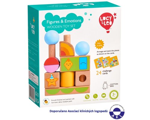 Tvary a emoce je dřevěná skládačka s různými geometrickými tvary. Součástí je základna s kulatými kolíky, různé geometrické barevné tvary s motivy emocí a 24 předloh. Cílem hry je vyzkoušet různá uspořádání a umístit všechny tvary na kolíky dle předloh. Po skončení hry lze skládačku umístit do lněného pytlíku. Skládačka je skvělá pro rozvoj logického myšlení, jemné motoriky a dětské představivosti.