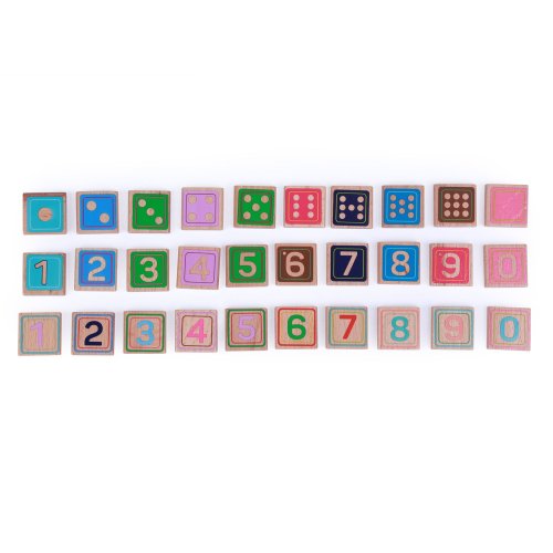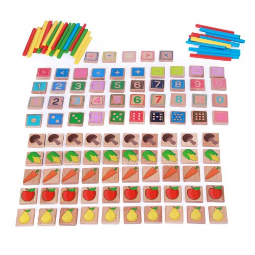Učíme se počítat je dřevěný edukativní set obsahující 135 prvků, který pomůže dětem vzbudit zájem o matematiku, osvojit si základní počítací schopnosti a prozkoumat koncept „více“ a „méně“. Lze jej použít pro děti předškolního i mladšího školního věku. Dřevěné kostky mají na sobě malovaná čísla i jiné obrázky, což umožňuje počítat různé kategorie předmětů. Jsou zde také matematické znaménka, stejně jako tečky na hracích kostkách a barevné počítací tyčinky - pro vytvoření zdravého zážitku z průzkumu matematiky. Hra se doporučuje hrát pod dohledem dospělé osoby. Délka tyčinek 8 cm. Rozměr kartiček 2,5 x 2,5 x 0,5 cm.