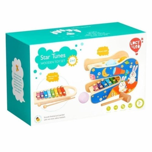Hvězdné melodie je dřevěná, velmi nápaditá, hudební dvoupatrová herní sada. Nahoře jsou 3 kulaté otvory, do kterých se umístí 3 dřevěné barevné koule, jež se pomocí dřevěného kladívka zatlučou skrz díry. Koule propadnou otvorem do spodní části sady, kde je umístěn vytahovací xylofon, který při jejich dopadu začne vydávat jemné zvuky. Xylofon lze ze spodní části sady vytáhnout a hrát na něj samostatně dřevěnými paličkami. Dřevěná herní sada je skvělý pomocník k rozvíjení hudebního sluchu a koordinace. Pomocí této sady může dítě vytvářet různé melodie a rytmy. Rozměr sady 24 cm x 17 cm x 14 cm. Rozměr xylofonu 27 cm x 11 cm x 3 cm. Délka paliček 20 cm. Délka kladívka 20 cm. Průměr koulí 4,5 cm.