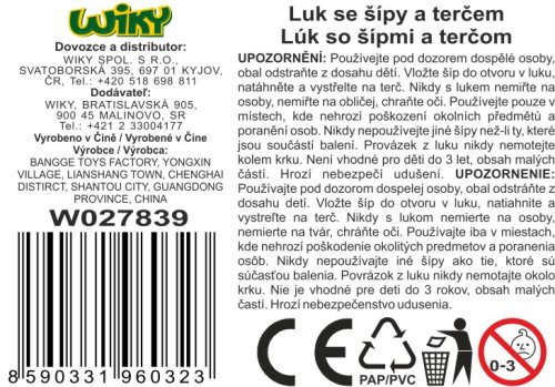 Luk se šípy a terčem. Součástí luk, 3 šípy, pouzdro na šípy, terč. Délka luku 57 cm, průměr terče 18 cm.