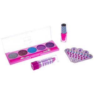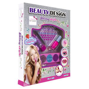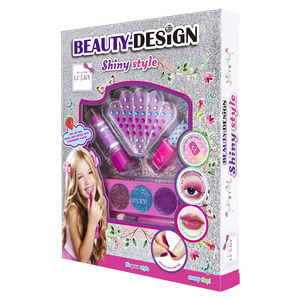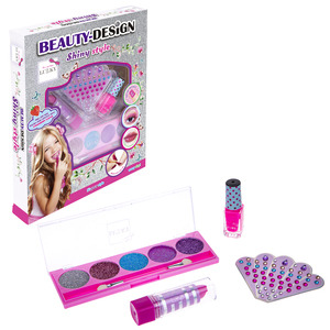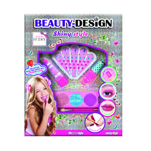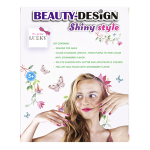 Sada Beauty-Design “Blištivý styl”. Obsah: 1× nálepky „drahokam“ na nehty, 1× rtěnka měnící barvu, 1× třpytivé krémové oční stíny s aplikátorem, 1× slupovací lak na nehty. Pro děti od 3let.