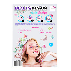 Sada Beauty-Design “Nehtové studio”. Obsah: 1× štětec, 1× pilník na nehty, 1× samolepky na nehty, 1× slupovací lak, 1× dózička se třpytkami, 1× lžička. Proděti od 3let