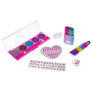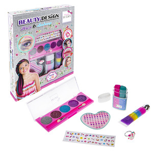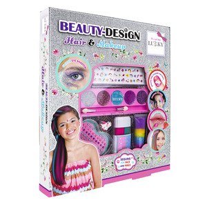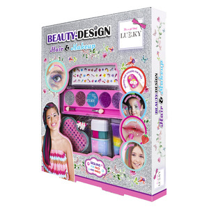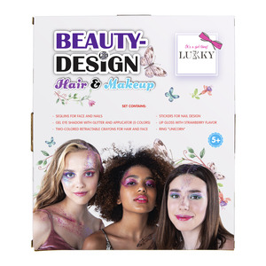 Sada Beauty-Design"Vlasy a makeup". Obsah: 1× samolepy na nehty, 1× lesk na rty s jahodovou příchutí, 1× prstýnek „jednorožec“, 1× náleky „drahokam“ na obličej a nehty, 1× třpytivé krémové oční stíny s aplikátorem, 1× křída na vlasy. Pro děti od 3let.