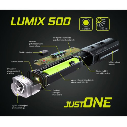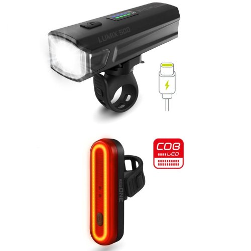 Sada osvětlení na kolo ONE Lumix 500 obsahuje dobíjecí přední i zadní světlo. Obě světla mají voděodolnou konstrukci a jejich montáž i demontáž je jednoduchá a rychlá. Přední světlo má vysoce výkonnou bílou LED diodu 6 W a 4 funkce – 3 intenzity svícení, blikání. Zadní světlo vysoce výkonné červené COB LED diody s 6 funkcemi – 2 intenzity svícení, 4 typy blikání. Obě světla lze nabíjet pomocí kabelu USB-C, který je součástí balení. Přední světlo LUMIX 500 - vysoce výkonná bílá LED dioda 6 W - 4 funkce – 3 intenzity svícení, blikání - grafické zobrazení funkcí - světelný tok 500 lm - dosvit cca 140 m - doba svícení až 13 h - dobíjecí Li-ion baterie s kapacitou 2.500 mAh - grafické zobrazení stavu nabití baterie - dobíjení baterie kabelem USB-C - voděodolná konstrukce IPX4 - montáž bez nářadí - rozměry 97 x 34 x 25 mm - hmotnost pouze 105 g Zadní světlo FLASH 40 - vysoce výkonné červené COB LED diody - 6 funkce – 2 intenzity svícení, 4 typy blikání - vodorovné i svislé umístění - světelný tok 40 lm - viditelnost cca 1.000 m - doba blikání cca 15 h - dobíjecí Li-ion baterie s kapacitou 710 mAh - indikátor nízkého stavu baterie - dobíjení baterie kabelem USB-C - voděodolná konstrukce IPX4 - montáž bez nářadí - rozměry 80 x 20 x 18 mm - hmotnost pouze 35 g