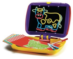 Z jedné strany je průsvitná obrazovka, která obrázek po jeho vložení osvětlí. Z druhé strany je tabule na kreslení a psaní suchými smazatelnými fixy.