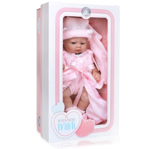 Luxusní španělská dětská panenka-miminko Berbesa Valentina. Panenka má vinylové tělíčko, ručičky i nožičky. Valentina má milou tvářičku, která vypadá jako opravdové miminko. Faldíky na ručičkách, nožičkách a bříšku ještě více připomínají novorozence. Panenka má krásná modrá kukadla, růžové rtíky, ručičky a nožičky jsou pohyblivé v kloubech. Součástí je roztomilý pletený růžový overal s mašličkou, pletená čepička, ponožky a krásná pletená zavinovačka. Obleček se dá sundat. Tělíčko miminka má jemnou vůni po vanilce. Délka panenky je cca 28 cm. Vhodné pro děti od 3 let. Při výrobě jsou používány výhradně kvalitní materiály.