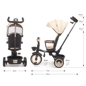 Twinkle je vybavena nastavitelnou rukojetí, funkcí volnoběhu, brzdou, bezpečnostními pásy s chrániči a pohodlným třípolohovým opěradlem a zaručuje úplnou kontrolu a pohodlí pro dítě i rodiče. Její lehký, ale odolný ocelový rám, kola s pěnovou výplní a kuličkovými ložisky, skládací konstrukce a praktické prvky, jako je síťovaná stříška, LED světlo, držák na nápoje a dva úložné boxy, z ní činí perfektní volbu pro každou příležitost – ve městě, na procházce nebo na výletě. Po odstranění rukojeti, kolejnic a stříšky lze Twinkle používat jako klasickou tříkolku.