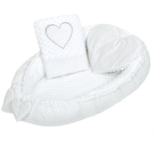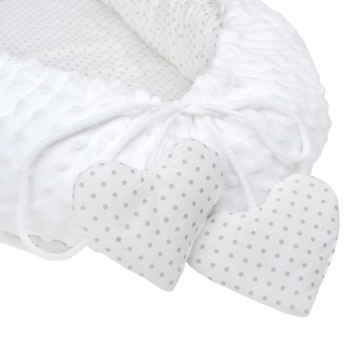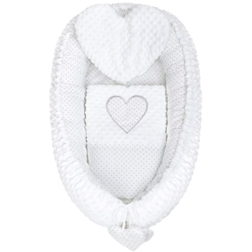 Luxusní hnízdečko s peřinkou pro miminka New Baby Srdíčko. Hnízdečko je praktický vynikající pomocník v prvních měsících života dítěte. Hnízdečko je oboustranné, může se používat z vnější i vnitřní strany. Hnízdečko má praktickou šňůrku, kterou lze upravovat velikost, může se více stáhnout anebo úplně uvolnit. Hnízdečko je vyrobené ze dvou typů tkanin, první je velmi měkká a na dotek příjemná, hebká Minky látka s výstupky pro stimulaci senzomotoriky a druhá je 100% bavlna. Součástí hnízdečka je polštářek ve tvaru srdce a peřinka zdobená srdíčkem. Hnízdečko má mnoho využití, lze používat v postýlce, v kočárku, na pohovce i na zemi. Rozměry: cca 55x75 cm, vnitřní rozměry: cca 35x59 cm. Peřinka: Rozměry: 65x47 cm. Složení: jedna strana 100% bavlna, druhá strana minky 100% polyester, výplň: antialergické vlákno. Produkt české značky.