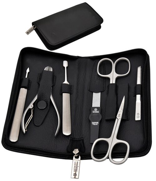 Luxusní manikúrová sada v černém koženém pouzdru se zapínáním na zip. Pfeilring Solingen je výrobce špičkového nářadí na manikúru a pedikúru, pochází ze Solingenu a má více než 100letou tradici. Jedná se o nejprestižnějšího výrobce v daném oboru, jehož nástroje procházejí přísnými výstupními kontrolami. Nástroje jsou vhodné pro profesionální i domácí použití. Vyrobeno z nerezové oceli.