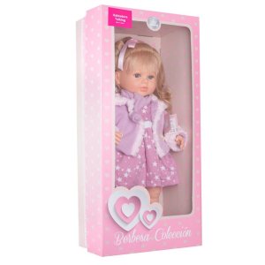 Luxusní mluvící španělská dětská panenka-holčička Berbesa Kristýnka. Holčička má milou tvářičku, která vypadá jako opravdová holčička. Panenka má měkké látkové tělo, gumové ruky a nohy propracované do nejmenších detailů. Na zádech má hrací modul, který se aktivuje po vyjmutí pojistky. Stačí stlačit panence tělíčko a panenka začne vydávat zvuk smějícího se dítěte a říkat „mama“ a „papá“. Tento zvuk se sám vypne po jednom cyklu. Panenka má modré oči, řasy a nádherné světlé dlouhé vlásky. Součástí panenky je fialový kabátek, hvězdičkované šatičky, bílé kraťasky, šála a ponožky s bílými botičkami. Obleček se dá sundat. Tělíčko panenky má jemnou vůni po vanilce. Délka panenky je cca 52 cm. Vhodné pro děti od 3 let. Při výrobě jsou používány výhradně kvalitní materiály. Baterie jsou součástí hracího modulu.