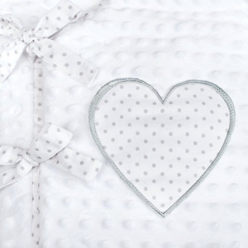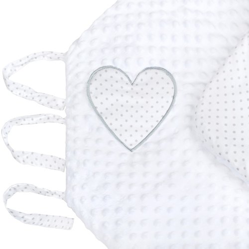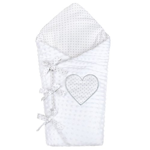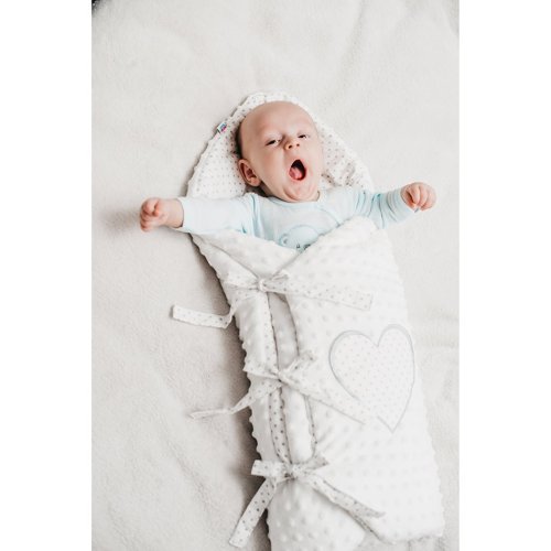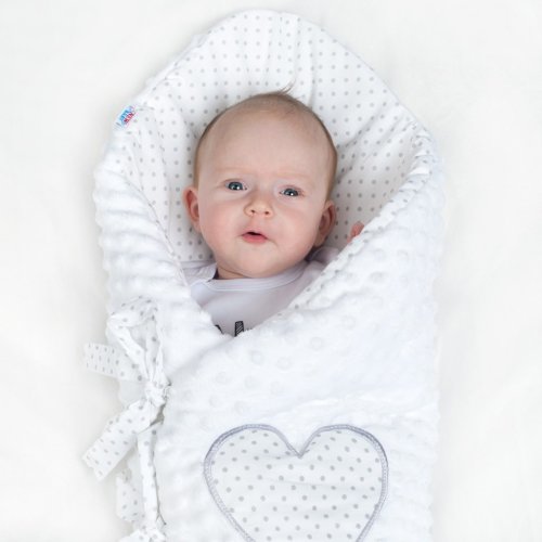 Luxusní šněrovací zavinovačka z Minky New Baby. Zavinovačka je vyrobena ze dvou typů tkanin a je zdobena krásným vyšívaným srdíčkem a šedým puntíkovaným bavlněným podkladem. První je velmi měkká a na dotek příjemná, hebká Minky látka s výstupky pro stimulaci senzomotoriky a druhou je 100% bavlna. Zavinovačka se zavazuje na tři řady stuh, které Vaše miminko pevně zavinou.