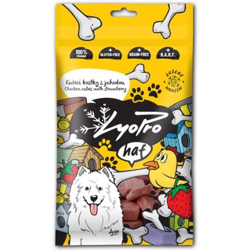Mrazem sušené maso Lyopro je ideálním pamlskem pro všechny kočičí gurmány a vyznavače BARF – syrové stravy. Protože pamlsky neobsahují dráždivé konzervanty, barviva ani nejčastější alergeny, je skvělou volbou pro psy trpící celiakií či potravinovými alergiemi. Doporučené podávání: