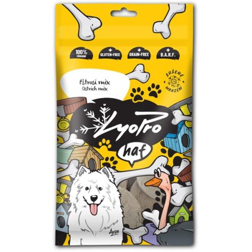 Mrazem sušené maso Lyopro je ideálním pamlskem pro všechny kočičí gurmány a vyznavače BARF – syrové stravy. Protože pamlsky neobsahují dráždivé konzervanty, barviva ani nejčastější alergeny, je skvělou volbou pro psy trpící celiakií či potravinovými alergiemi. Doporučené podávání: