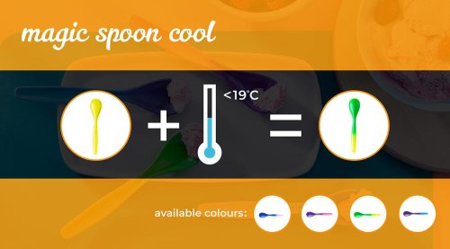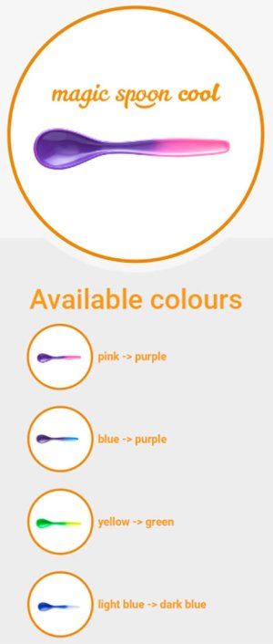 Plastová lžička, měnící barvu, když je vystavena chladu. Reaguje na teploty pod 19 °C. Lžičky jsou bezpečné bez BPA, PAH a ftalátů.