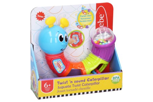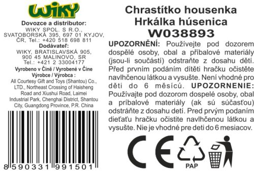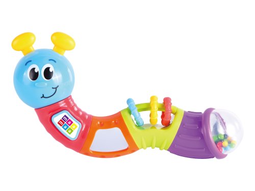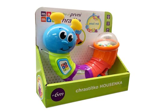 Maamaa Chrastítko housenka. Velikost 16cm. Housenka je rozdělena na části, se kterými lze točit. Hrká, chrastí, má pískací tlačítko a zrcátko.