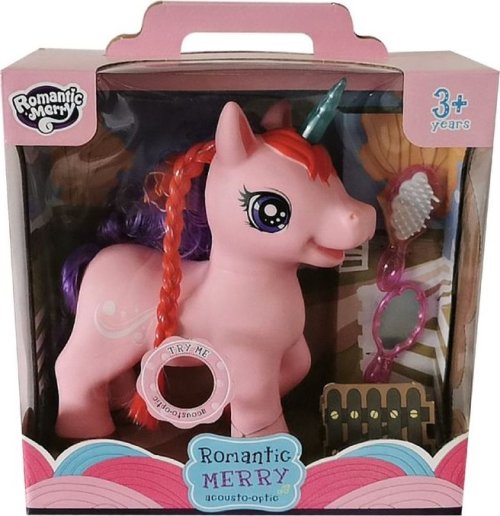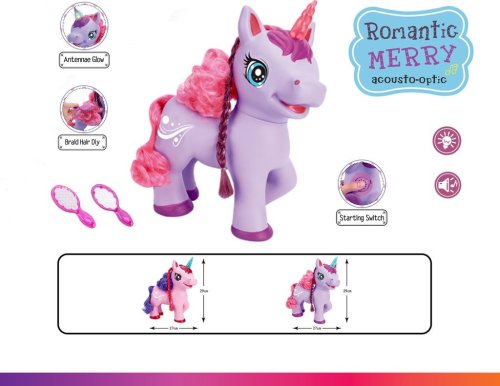 po stisknutí tlačítka na bříšku vydává zvuky a zpívá anglickou písničku při zvuku mu svítí roh otáčí hlavu hřívu lze česat a zaplétat podle libosti pro provoz jsou třeba 3 x 1,5V baterie AG13 (součástí balení)