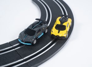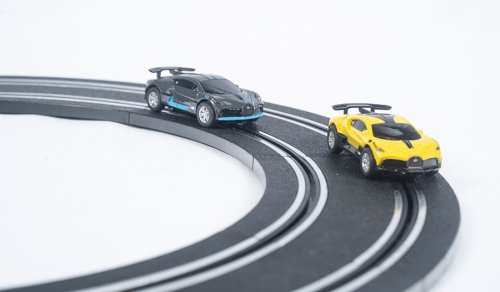 8,04 m dlohá autodráha na trafo. 3 různé druhy složení, 2 licenční autíčka Bugatti.
