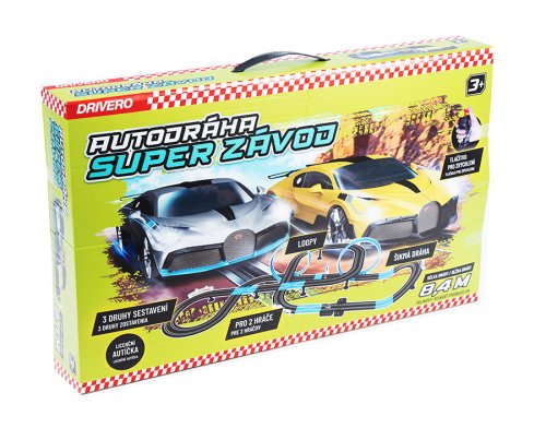 Autodráha MAC TOYS DRIVERO autodráha 8,4m 8,04 m dlohá autodráha na trafo 3 různé druhy složení, 2 licenční autíčka Bugatti