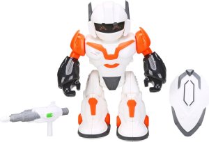 chodí vydává zvuk svítí mu oči horní část těla se otáčí o 360° v ruce drží zbraň a štít výška cca 20 cm