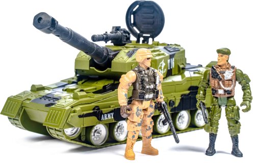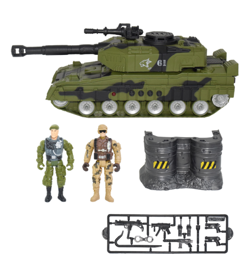 Balení obsahuje: tank se zvukovými a světelnými efekty, 2 postavičky vojáků s pohyblivými klouby, bariéru, zbraně a další drobné příslušenství vojáků