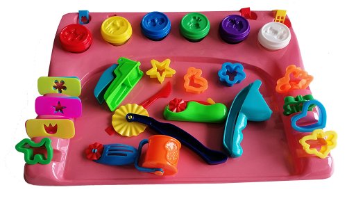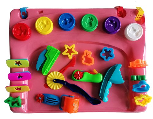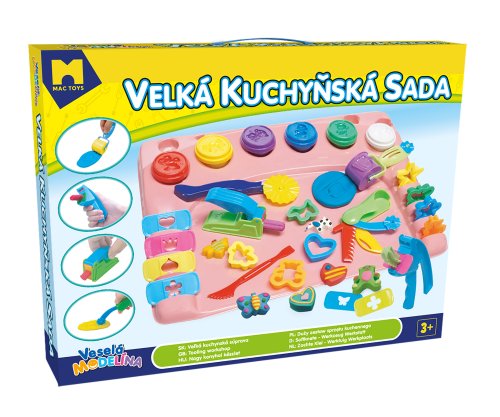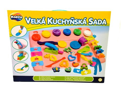 Sada obsahuje:6 kelímků plastelíny, 8 formiček, 1 váleček, 1 kolečko, 1 tvořítko (plastový nožík), 9 nástavců ke strojkům, 2 protláčecí strojky, 1 skládací plastový nožík s 3 různými břity.